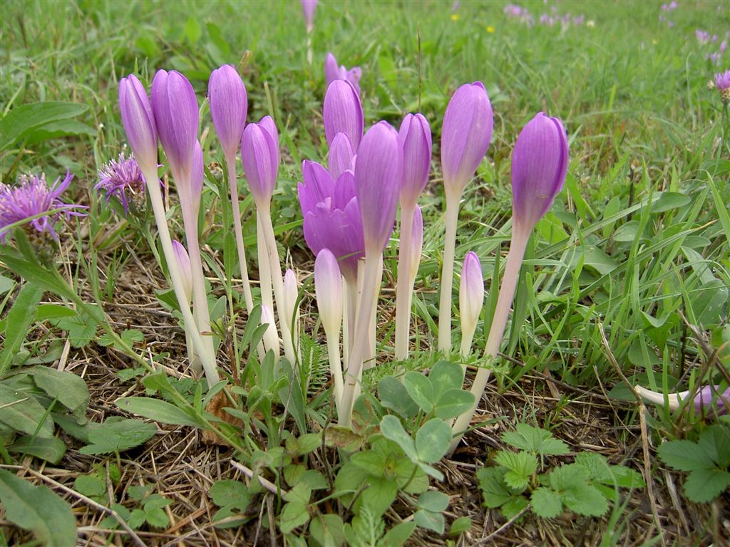 - колхикум осенний белый — очень редко; от одной клубнелуковицы во второй половине сентября распускаются от пяти до семи штук до 15 см длиной, распускаются цветки с белоснежным околоцветником с желтым центром;