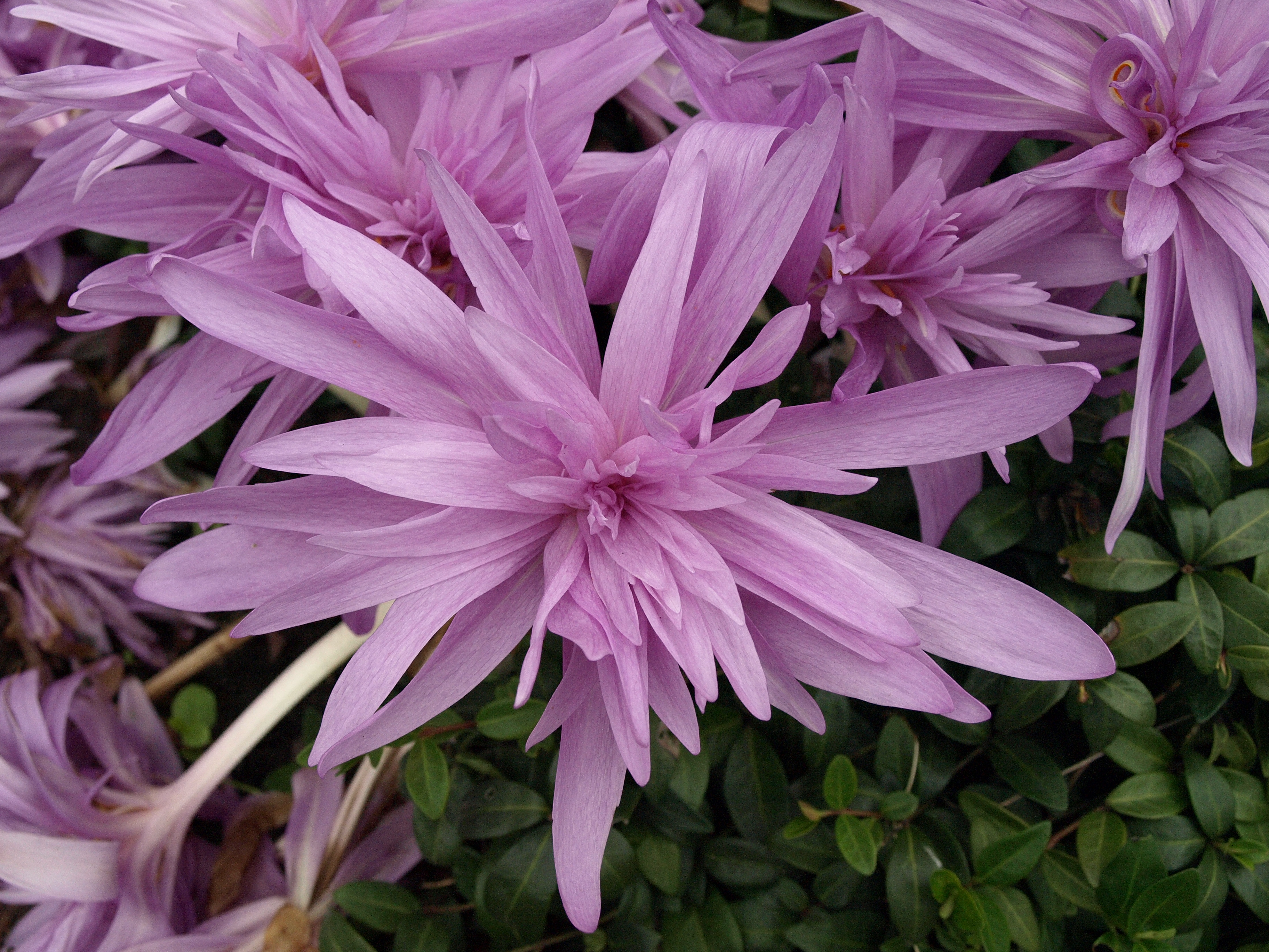 - Колхикум осенний махровый с цветками сирени длиной до 12 см и диаметром около 5 см, состоящими из большого количества лепестков — до 35 в одном цветке.Листья темно-зеленые, длиной до 25 см и шириной 4 см. Цветет позже других колхикумов — в конце октября;