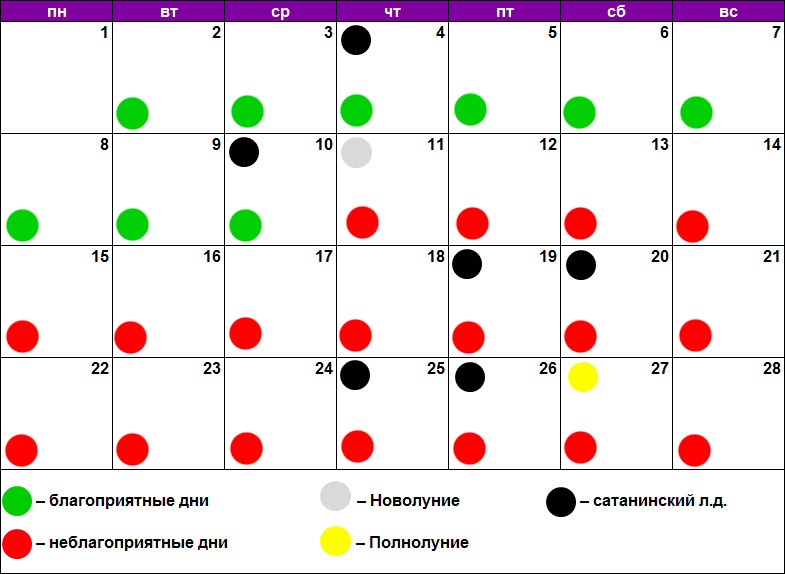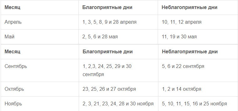 | Хорошие дни | — | 6-10, 12в-16 | 8-12, 14-18 | 7-11, 13-17 | 6-10, 12в-16 | 5-9, 11-15 | 5-9у, 11-15 | 3-7, 9-13 | 2-6у, 8-12 | 1-5, 7-11, 30, 31 | 1-3, 5в-9, 29, 30 | 1-3, 5-9 | |