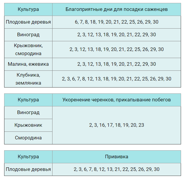| Рубка деревьев, выкапывание корней (чтобы не росли) | Лучшие дни | 1, 2, 29в, 30у | — | — | — | — | — | — | 7в | 4, 5 | 1-3у, 28в-30 | 25, 26 | 22-24у |