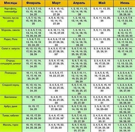 БахчевыеАрбуз,Дыня | 1-5, 9, 10 14, 15 23-31 | 1, 2, 5-7 10-16, 21-26 28 и 29 | 3, 6-13 18-25 30-31 | 4-10, 13, 14 17-23 26, 27 и 31 | 1-6, 10-13 16-19 22-24 27-30 | 2-4 15-21 25-31 |