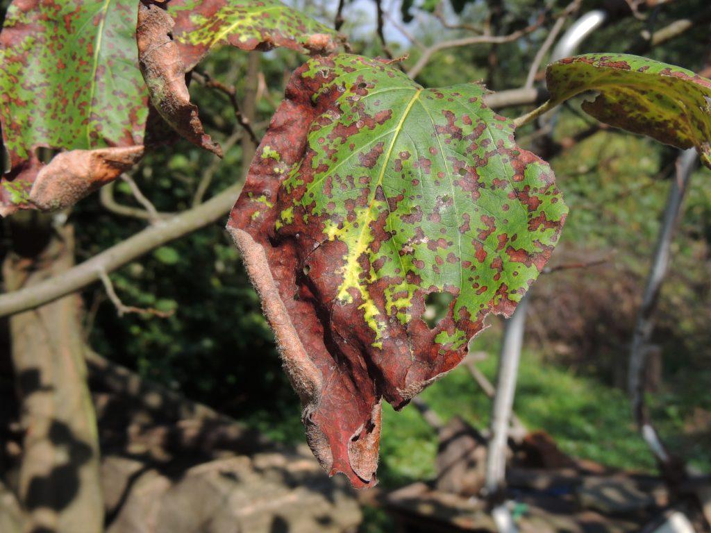 Зараженные листья груши становятся черными, а листья яблони обычно коричневыми.