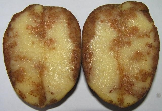 Одна из причин появления неприглядных коричневых отметин и колец на пораженных клубнях, известное как опрыскивание, которое часто может привести к тому, что продовольственный урожай станет непригодным для продажи.