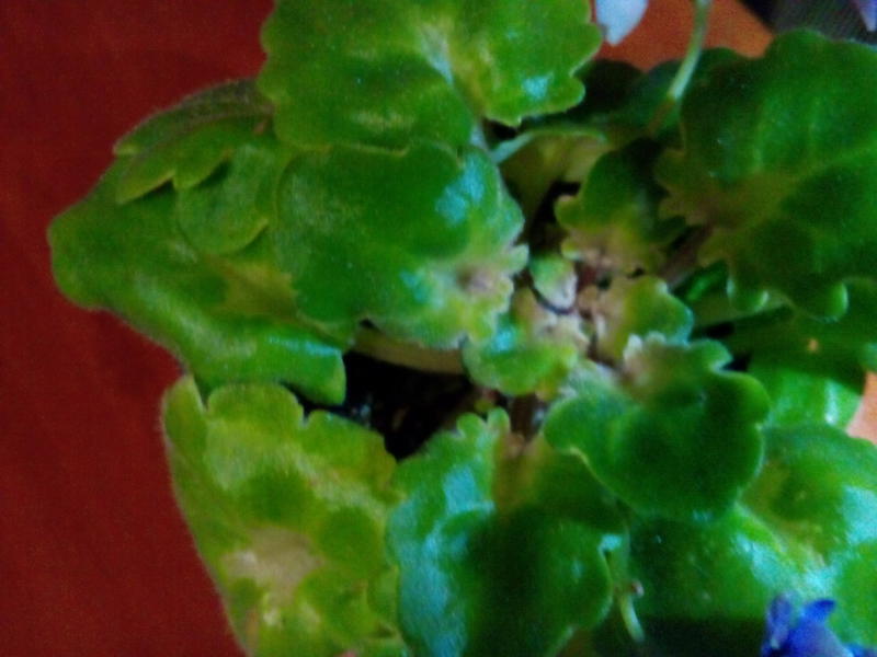 2. Цикламеновый клещ. Если у Вас повреждены молодые листья, это цикламеновый клещ. Также листья деформируются и на них появляются желтые пятна, центр розетки уплотняется. При поражении этим видом клеща, листья становятся хрупкими и более опушенными. Большая опасность кроется в том, что фиалка может перестать расти, так как центр роста усыхает.