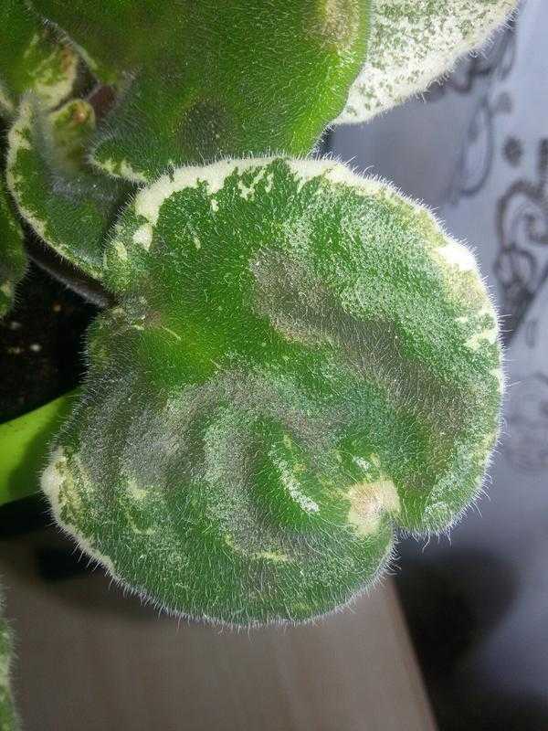 Желтые или белые пятна или линии на листьях африканских фиалок вызваны контактом с холодной водой. Держите листья сухими при поливе и используйте воду комнатной температуры, чтобы избежать этой проблемы.