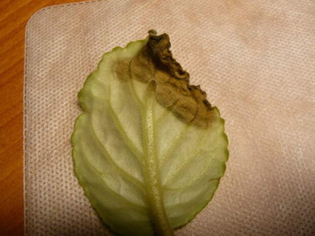 Ботритис  еще одно заболевание, вызываемое грибком. Его первое появление может быть в виде повреждений на нижней стороне листьев, которые по внешнему виду похожи на повреждения водой. Листья и стебли становятся темными, зеленовато-коричневыми и могут начать выглядеть так, как будто на их поверхности появился пушистый налет. На цветках появятся коричневые пятна или весь цветок станет коричневым и увянет. Botrytis также трудно поддается лечению, но, в отличие от коронной гнили, у вас есть шанс спасти свою фиалку.