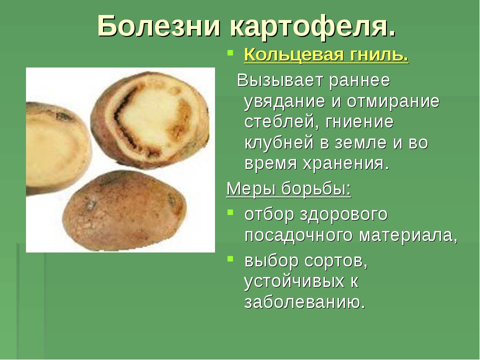 Специальных средств для борьбы с кольцевой гнилью не существует. Чтобы выявить заражённые картофелины, посадочный материал прогревают в течение 2–3 недель при температуре около 20ºС. Те клубни, на которых появились неглубокие чёрные «ямки» с размягчившейся под ними мякотью, сразу же выбрасывают. В случае массового поражения рекомендуется заменить весь посадочный материал.
