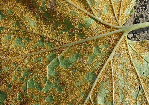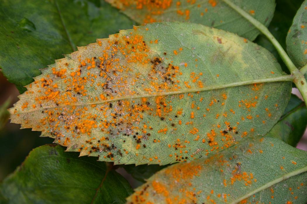 Примечание: ржавые оранжевые пустулы, характерные для болезней ржавчины, на нижней стороне листа.