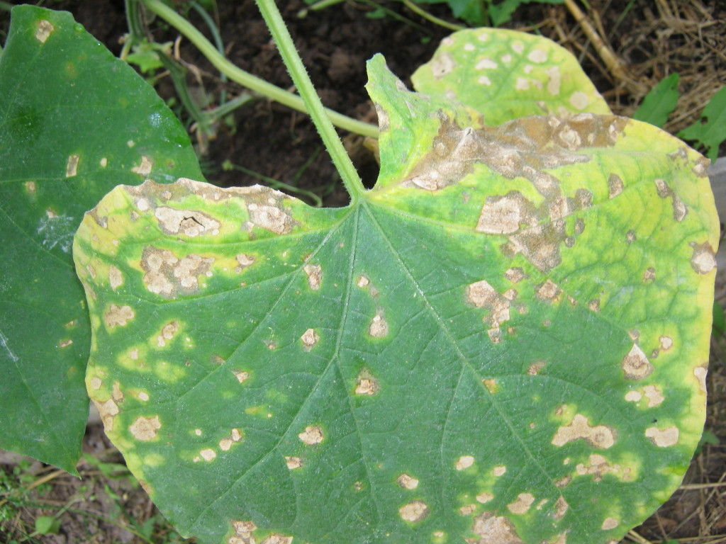 Возбудитель заболевания – грибок Colletotrichum lagenarium, он заражает огурцы уже на стадии рассады. На тепличных кустах болезнь проявляется в виде желтоватых, коричневых пятен округлой формы на внешней стороне листа ближе к его краю. Пораженная ткань листовой пластины выпадает, образуя многочисленные дырки.