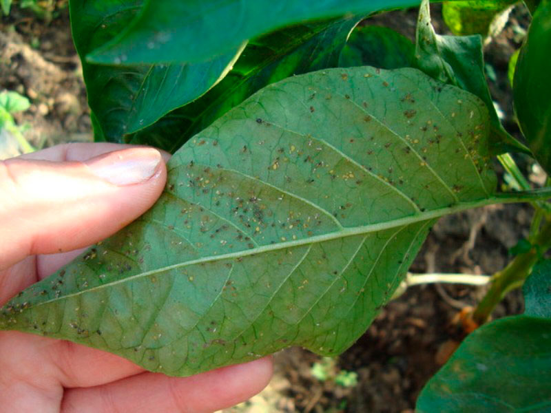 Распространенное заболевание, его провоцирующие факторы — высокие температуры и повышенная влажность в теплицах, загущенные посадки. На тех частях куста, где поселились бактерии, возникают коричневые изъяны, на плодах образуются темные точки, разрастаясь, превращаются в язвы. Больные растения следует удалить и уничтожить.