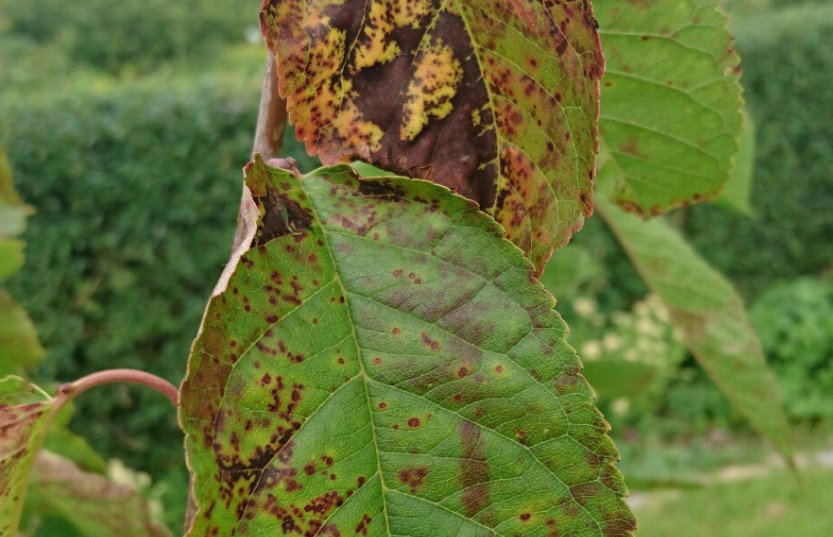 Коккомикоз. Одна из самых опасных грибных болезней. В первую очередь поражает листья, на последних стадиях – побеги и плоды. Как правило, проявляется в середине лета.