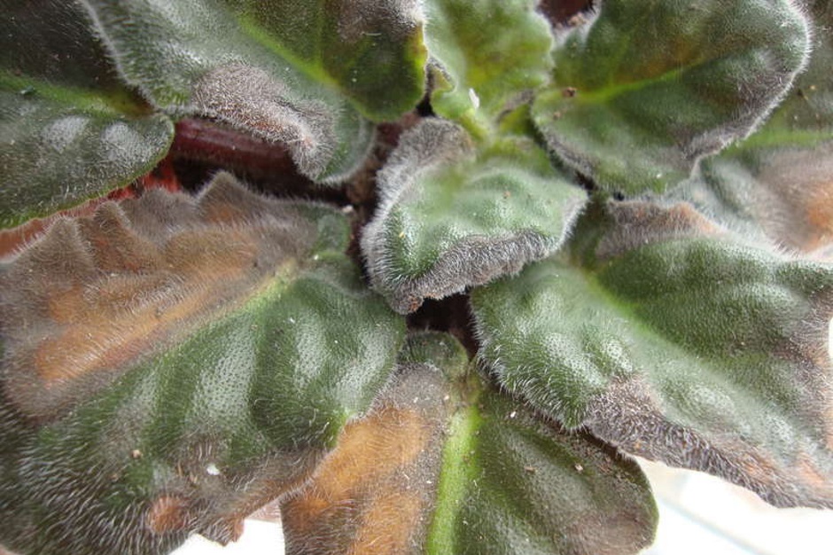 Если на фиалке образовался пушистый налет коричнево-сероватого оттенка на отростках, цветках и листиках, то это указывает на появление грибка ботритиса.