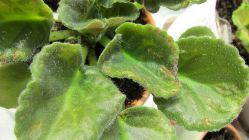 Такую болезнь фиалок вызывают ржавичные грибки. Если растение поражено ржавчиной, то с двух сторон листа возникают желто-бурые бугорки. Для созревания спор этих грибков достаточно немного воды на листьях, а также влажный и теплый микроклимат в комнате.
