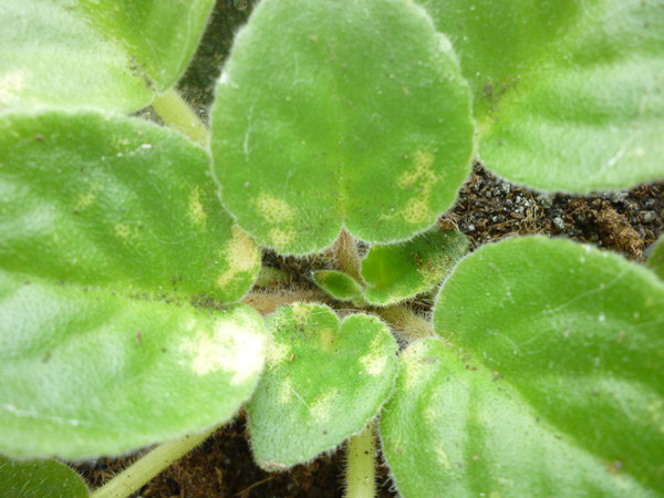 - Цикламеновый. Этого вредителя можно увидеть на молодых листьях, находящихся в середине розетки, оставляя на них желтые точки.