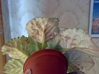 - Светлые пятна на листьях образуются обычно из-за полива слишком холодной водой или солнечного ожога. Это бывает, если прямые солнечные лучи попали на влажную поверхность листа.