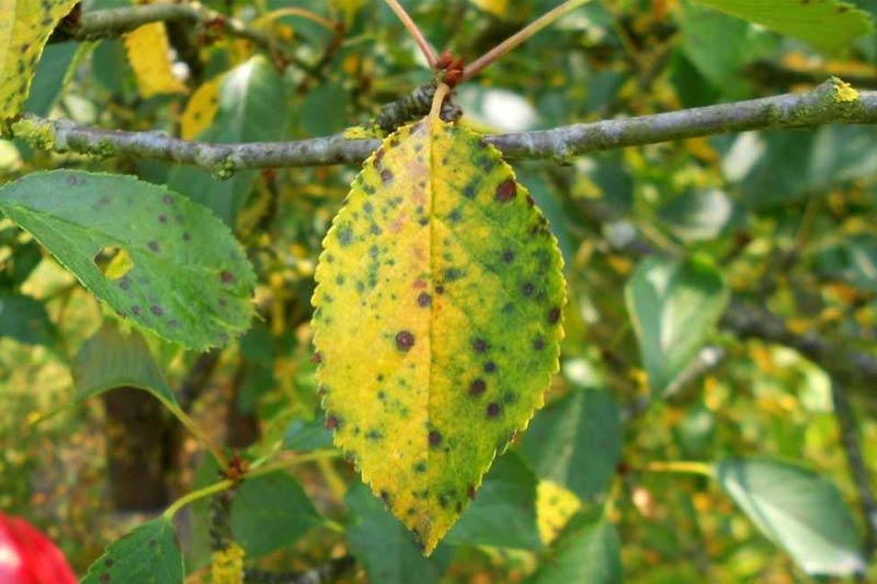 | Пятнистость на листьях Coccomyces | Круглые пятна от пурпурного до красновато-коричневого цвета до 1/8 дюйма в диаметре образуются на листе в начале лета, а по мере прохождения сезона появляются новые пятна. Пятна могут исчезнуть, оставив вид пробоины. Пораженные листья желтеют и преждевременно опадают. | Blumeriella jaapii ( Coccomyces ) | Примените фунгицид по мере прорастания листьев весной. |