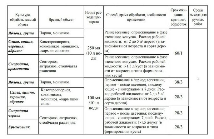 | Яблоня, груша, айва | Парша и другие пятнистости, монилиоз | Молодняк — до 2л. Плодоношение — до 10 л |