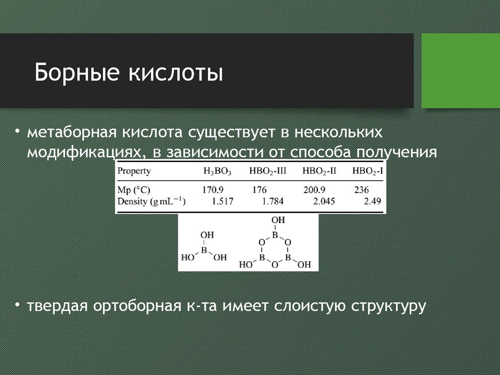 Борная кислота проявляет очень слабые кислотные свойства. Она сравнительно мало растворима в воде. Её кислотные свойства обусловлены не отщеплением протона Н+, а присоединением гидроксильного аниона.