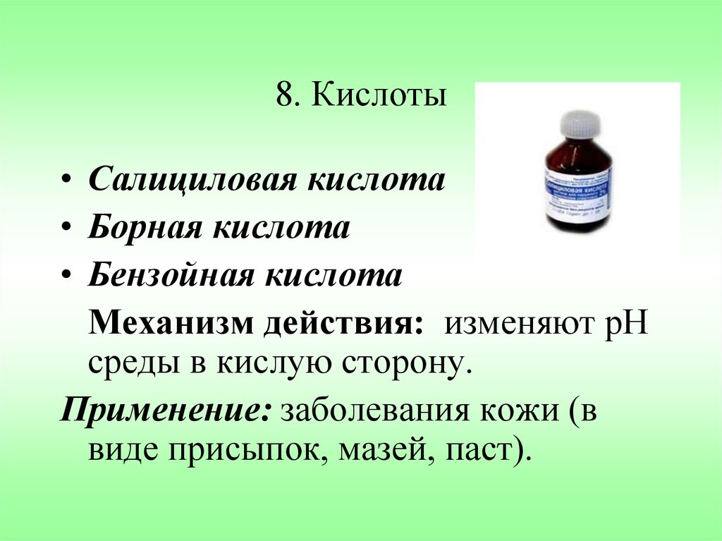 - Также на основе борной кислоты производятся различные комбинированные препараты (группа АТХ D08AD), например паста Теймурова.