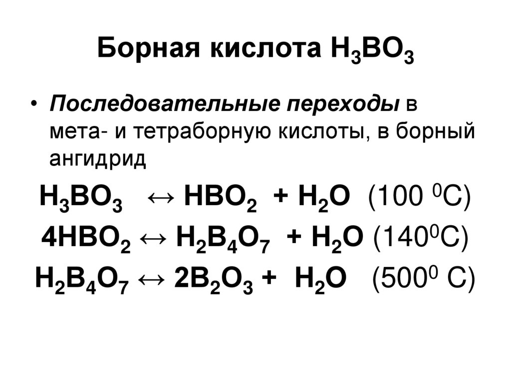 При нагревании ортоборная кислота теряет воду и сначала переходит в метаборную кислоту, затем в тетраборную h3B4O7. При дальнейшем нагревании обезвоживается до борного ангидрида.
