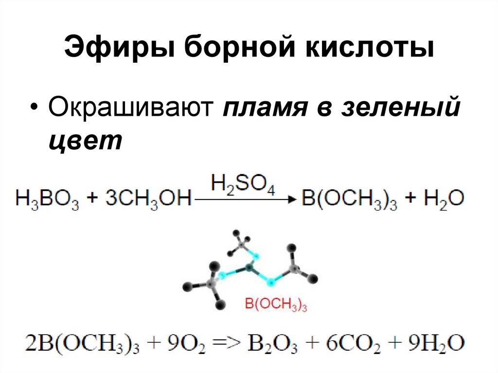 Он образует эфир триметилбората с метанолом, который горит бриллиантовым зеленым, и аналогично образует триэтилборат с этанолом, который также горит зеленым.
