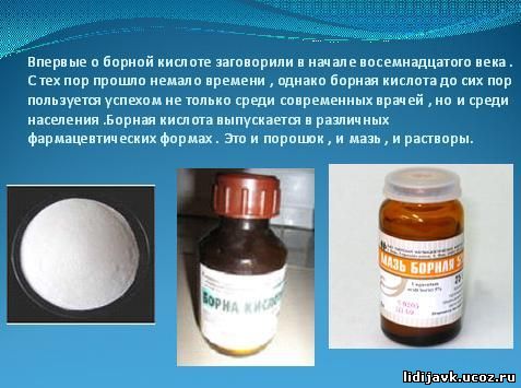 Борная кислота применяется в медицине с 60-х годов XIX века как антисептическое средство, не раздражающее ран и не имеющее вкуса, запаха и цвета.