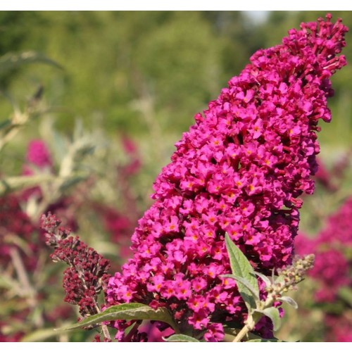 Буддлея Сантана цветет темно-розовыми красками, иногда ее еще называют “буддлея пурпурная”.