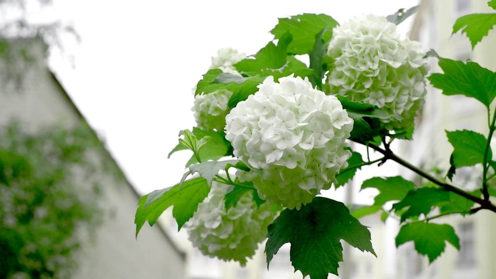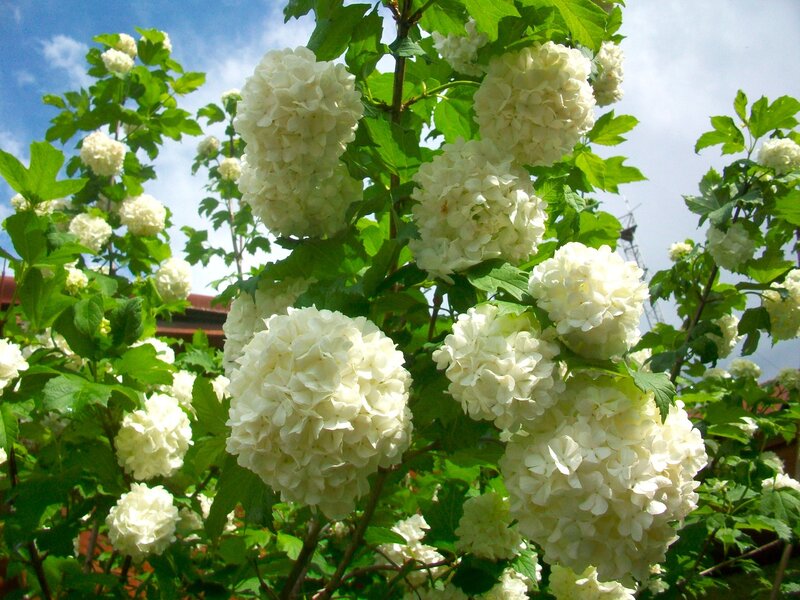 Оригинальный сорт калины стерильной «Снежный шар» получил признание за необыкновенные соцветия напоминающие снежки, которые украшают наши дачи и садовые участки поздней весной и ранним летом. Взрослые сформированные кусты калины Бульденеж способны нести тяжелые шары, гирляндами нанизанные на склоненные ветви, до 500 штук. Обильные соцветия, проходящие цикл развития за 25-35 дней, погружают нас в радостное ожидание приятных сюрпризов предстоящего лета. Распускаясь, мелкие цветки имеют бледно-зеленую, затем зеленовато-белую окраску, а когда полностью разворачиваются – теснят друг друга яркими плоскими крупными пятилопастными чисто-белыми венчиками, поражая пышностью соцветий-щитков. Ни тычинок, ни пестиков у этих бесплодных растений нет. У некоторых сортов («Розеум» – Roseum, «Пинк Сенсейшн» – Pink Sensation) венчики, отцветая, розовеют. Сегодня расскажем как правильно обрезать калину Бульденеж.