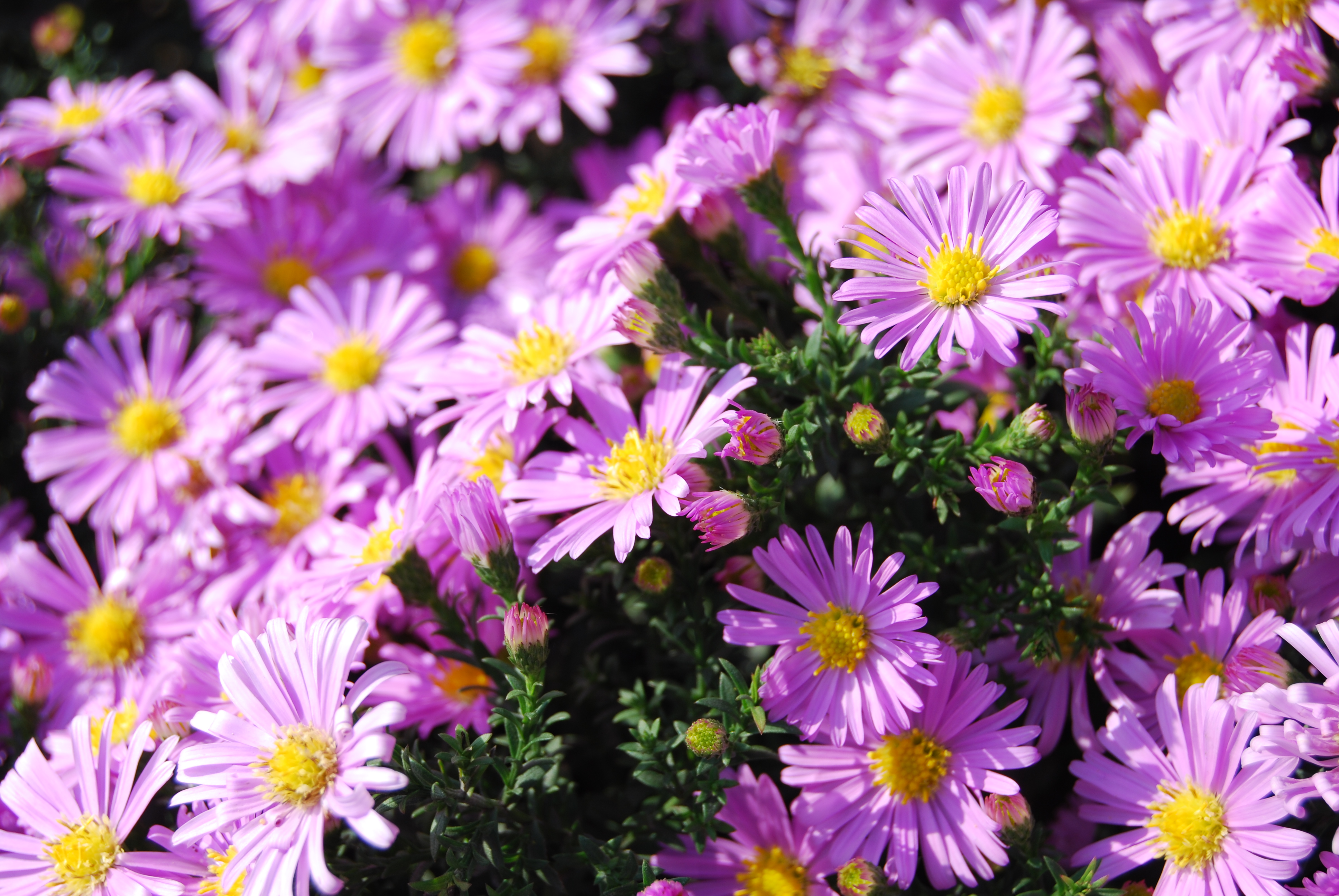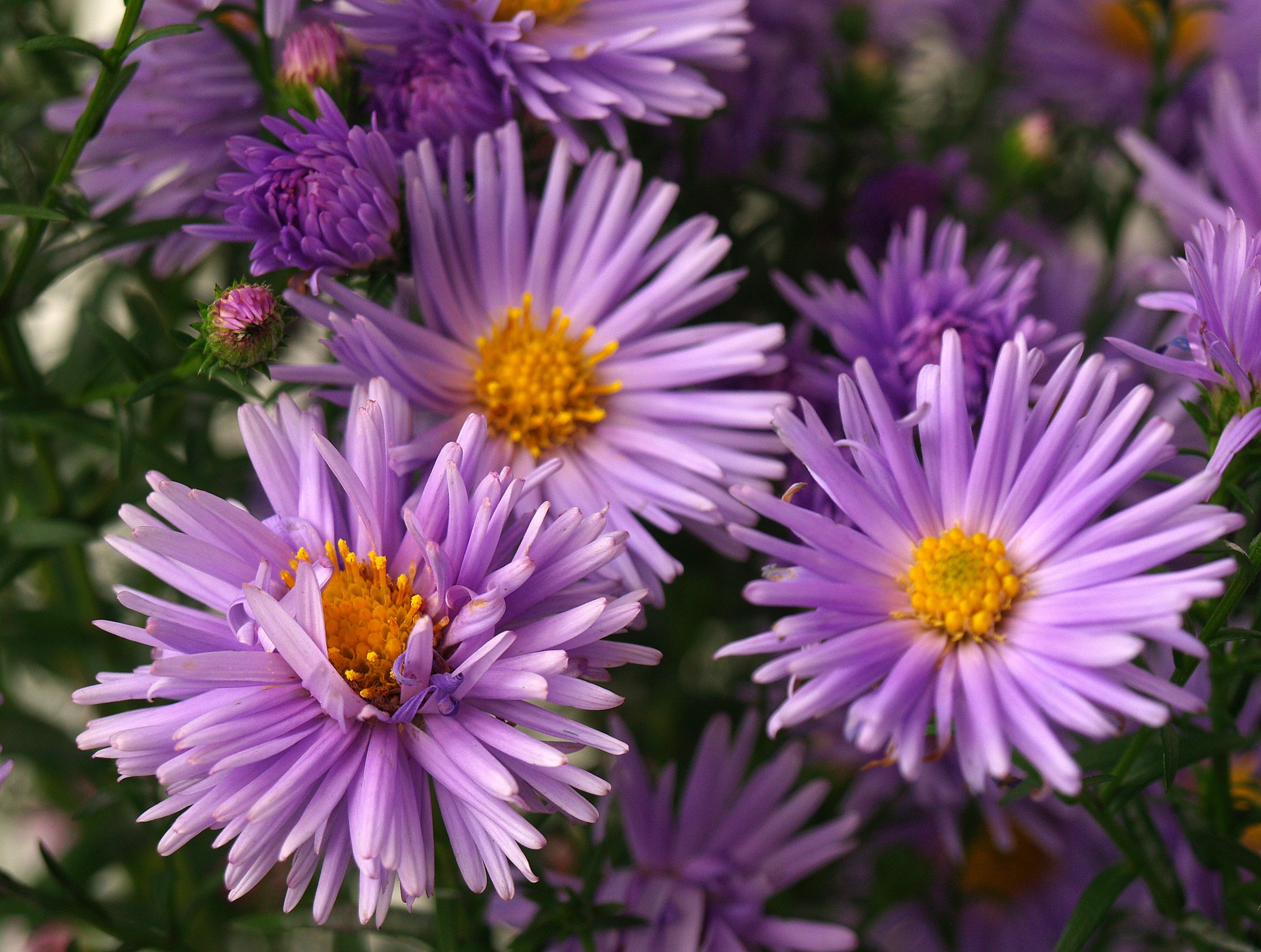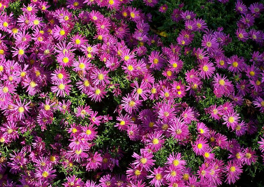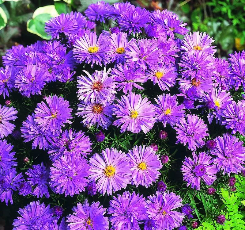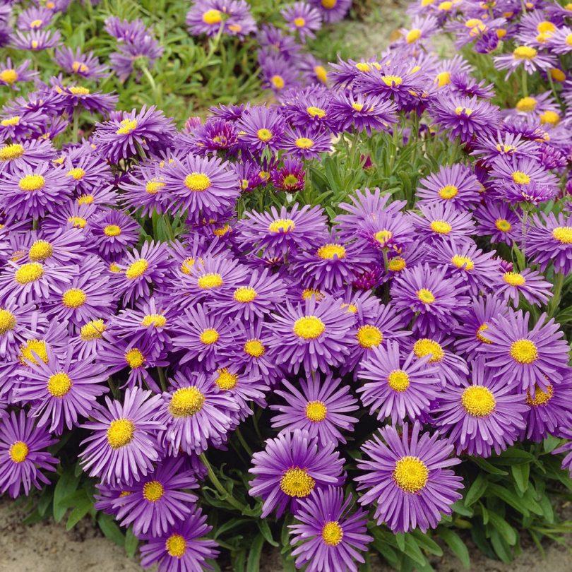 Отдельные цветки астры маленькие, не более одного-двух дюймов в диаметре, но когда растения цветут, они покрываются розовыми, пурпурными и сверкающими белыми цветами. Обильноцветущий «Purple Dome» и многие другие имеют ярко-желтый центр, как у ромашки, но у некоторых есть густые перистые цветки, которые скрывают центр.
