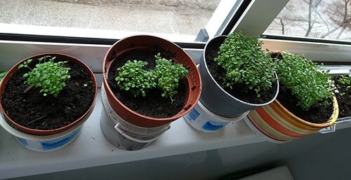 Раз в день укрытие снимают минут на 15 для проветривания. Когда в горшочках появятся первые всходы, их прореживают для лучшего роста культуры, снимают укрытие и емкости с посевами переносят на подоконник или застекленный утепленный балкон.