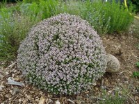 Кустовой чабрец образует компактные кусты высотой 22-25 см. Этот вид тимьяна, в отличие от ползучего, имеет рыхлые куртины. Идеально подходит для украшения садовых дорожек по сторонам.