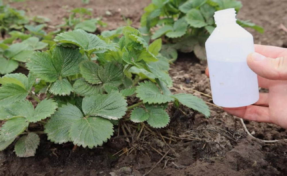 - Плодоносящую клубнику безопасно обрабатывать нашатырным спиртом и йодом, разведенными водой. Также можно использовать перекись водорода, золу и борную кислоту.