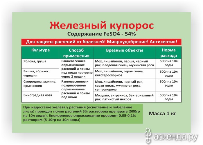 Антисептические свойства железного купороса также применяют в садоводстве. Обработку проводят только в осеннее время, после листопада, т.к. раствор железного купороса сжигает листья.