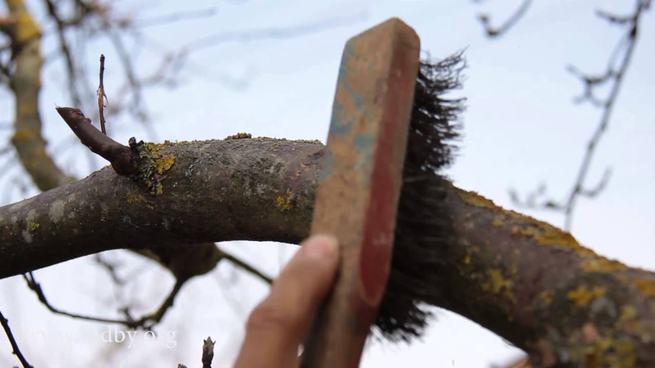 Перед тем, как приступать к опрыскиванию деревьев, осмотрите особенно внимательно ствол и ветки каждого дерева. Если обнаружите лишайники и мох, следует аккуратно удалить их металлической щеткой.