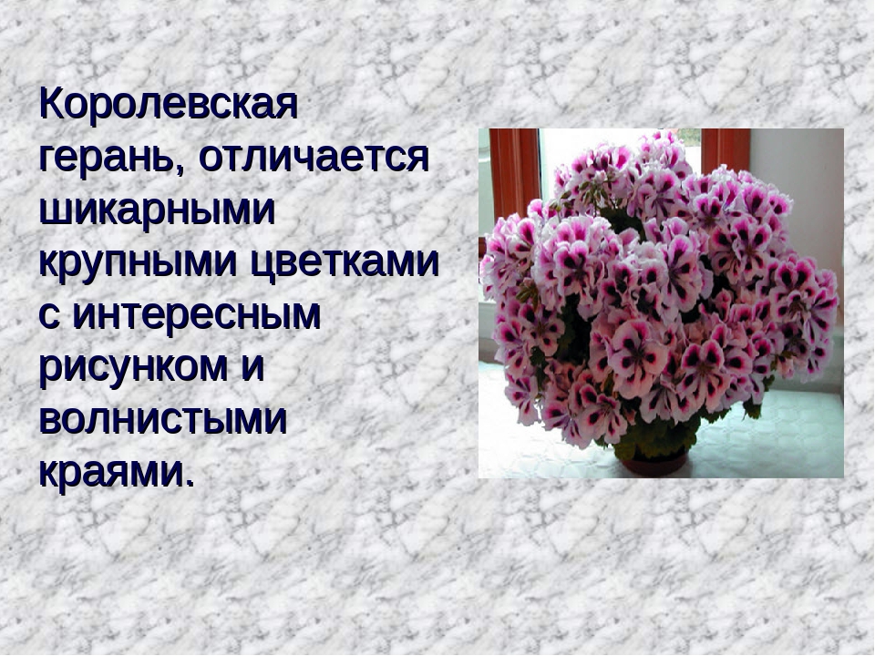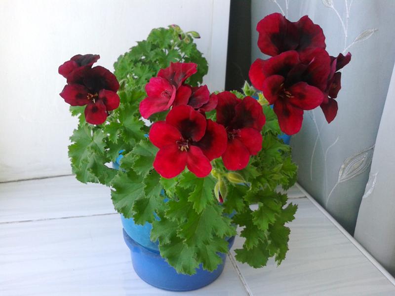 Пеларгония королевскаяЭтот сорт пеларгонии является очень красивым и привлекательным на вид. Не зря она получила свое второе название «королевская», так как требует более деликатного ухода. Сами цветки являются довольно крупными по сравнению с другими видами растений семейства гераневых. В основном все они гофрированные и имеют темнее оттенки, такие как бардовые, красные или фиолетовые. Также период их цветения дольше других и сами цветки издают приятный аромат.