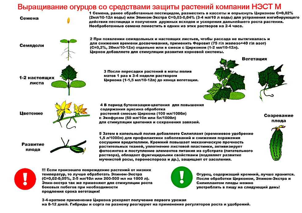 Наибольшей популярностью пользуются внекорневые подкормки составами «Циркон» и «Эпин». Они обладают стимулирующим воздействием, повышают иммунитет огуречных кустов и усиливают их сопротивляемость инфекциям.