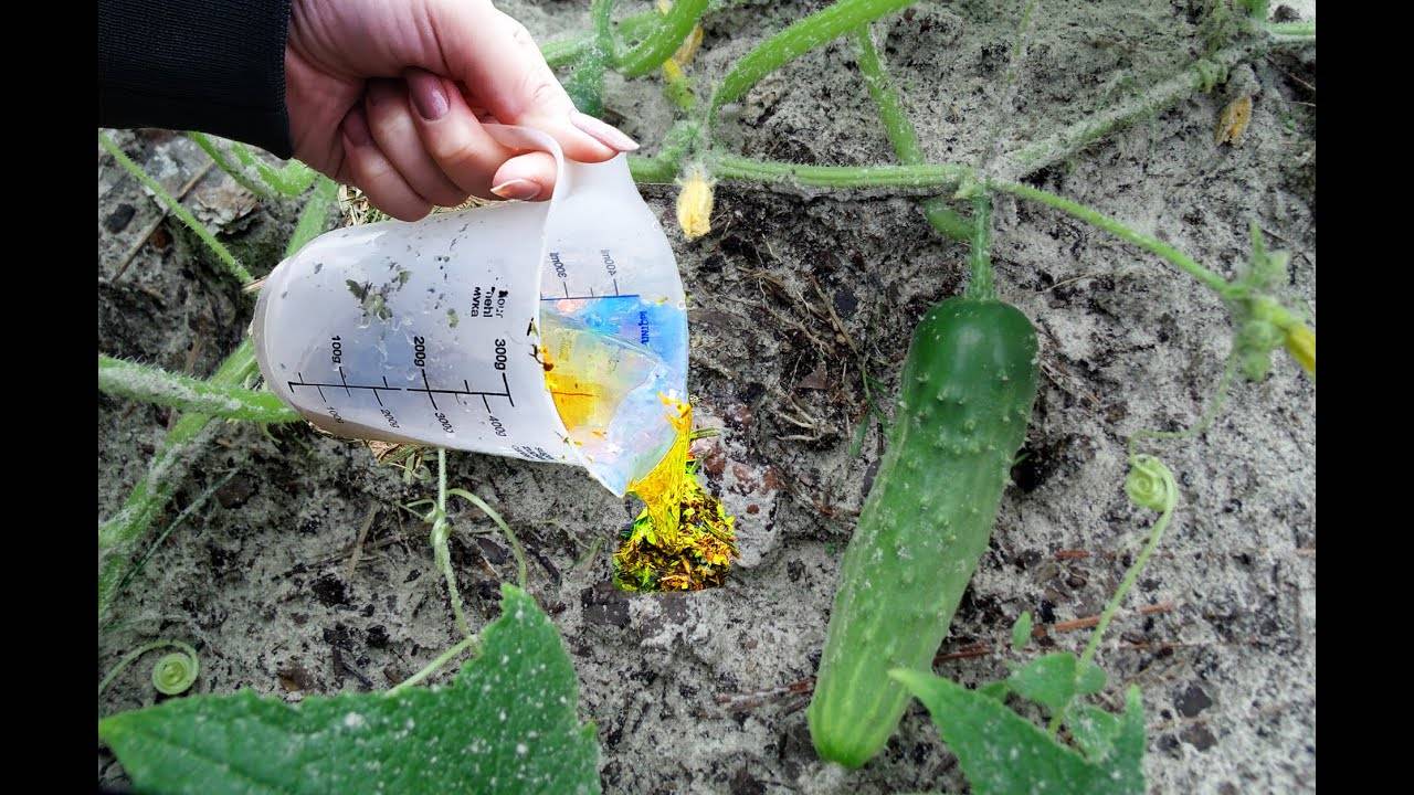 …Все хорошо перемешивают и полученным раствором опрыскивают посадки огурцов, соблюдая трехнедельный интервал (до начала уборки). Что делать, если листья желтеют?