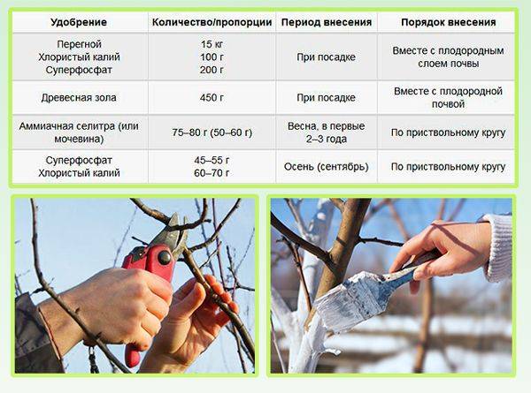 - Под одно молоденькое деревце вносят компост либо перепревший навоз в размере 9,5 кг, гранулированный Суперфосфат (75 г) и калийную соль (около 30 г).