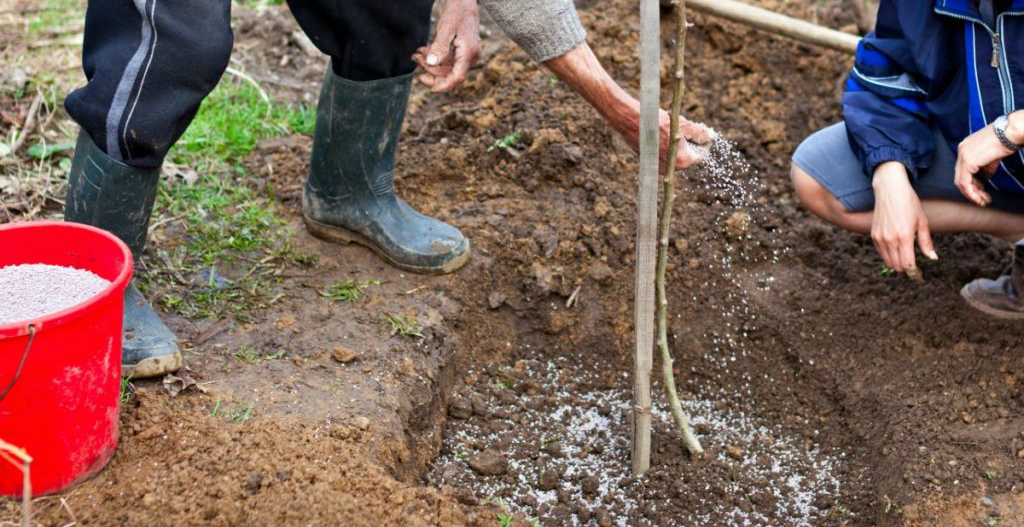 Следующий этап – внесение удобрений. Для этого применяют минеральные комплексы. Их просто вносят в приствольные канавки, глубиной до 20 см. Сначала засыпают фосфорсодержащие удобрения, а потом калий. Между слоями должен быть слой грунта не менее 5 см.