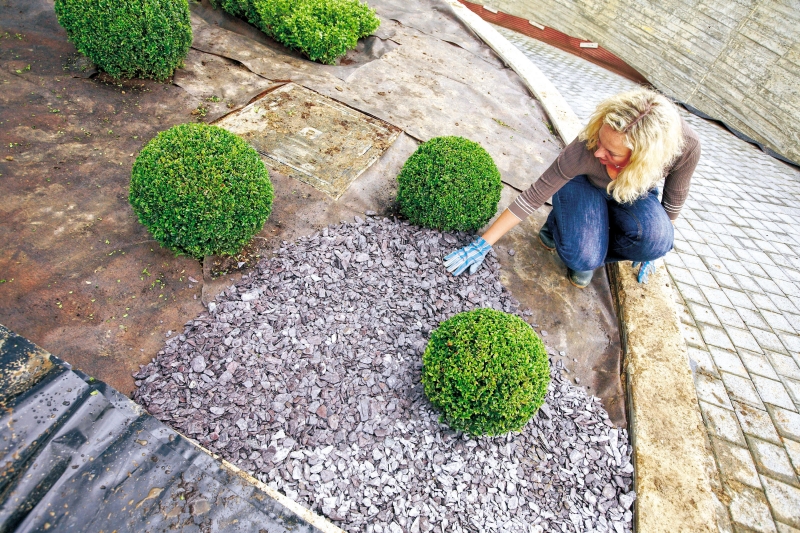 Чтобы не росла трава, дорожки между грядок закрывают насыпными материалами, укладывая их на подложку