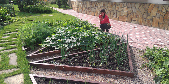 Особенно красиво при такой организации дорожек смотрятся грядки с приподнятыми бортиками. Они же не дают камушкам излишне рассыпаться по сторонам.