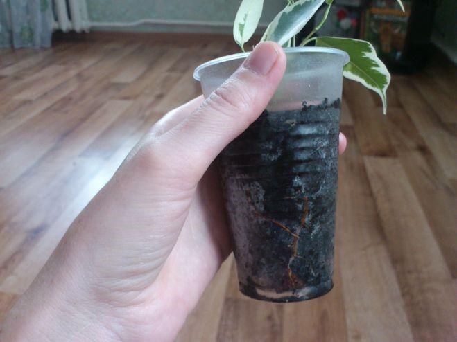- Высадить в небольшой вазон или стаканчик для укоренения с почвосмесью (можно купить в магазине грунт для укоренения). Желательно полить укоренителем, в котором содержатся питательные вещества и стимуляторы, ускоряющие укоренение черенка фикуса.