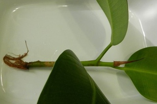 Удалить нижние листочки (для крупнолистных обычно — один лист). У очень крупных Лировидных фикусов обрезать две трети листьев для меньшего испарения влаги. У Каучуконосных можно скрутить листья в трубочку с той же целью и аккуратно зафиксировать резинкой для денег или веревочкой. После получения черенка выполняем следующие действия: