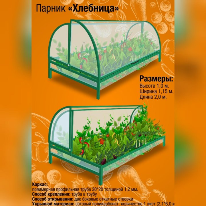 Парник «Хлебница» отлично подойдет для выращивание низкорослых растений, зелени или рассады. Верхняя часть парника состоит из двух откидных створок, которые закреплены на шарнирах к каркасу и могут открываться в обе стороны. Данная конструкция позволяет получить доступ к посадкам со всех сторон.