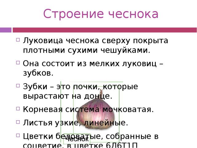 Чеснок (Allium sativum L.) — однолетнее растение семейства луковые. Размножается вегетативно: почками-зубками, образующимися в пазухах листьев, а у стрелкующегося чеснока — и бульбочками (воздушными луковичками), развивающимися на стрелке.