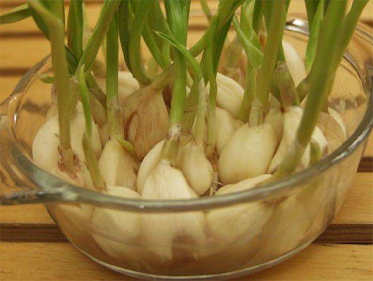 корни примерно до четверти дюйма, а листья примерно до одного дюйма. Чеснок, который