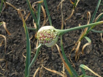 - Важно не пропустить время уборки. Основные признаки – стебель начинает клониться к земле, а нижние листья – подсыхать. Если передержать головки в земле, то луковицы начнут распадаться на зубки, посадочный материал в дальнейшем будет хуже храниться. Также Вы рискуете растерять «деток», которые после того, как покровные чешуйки лопнут, выпадут на землю.