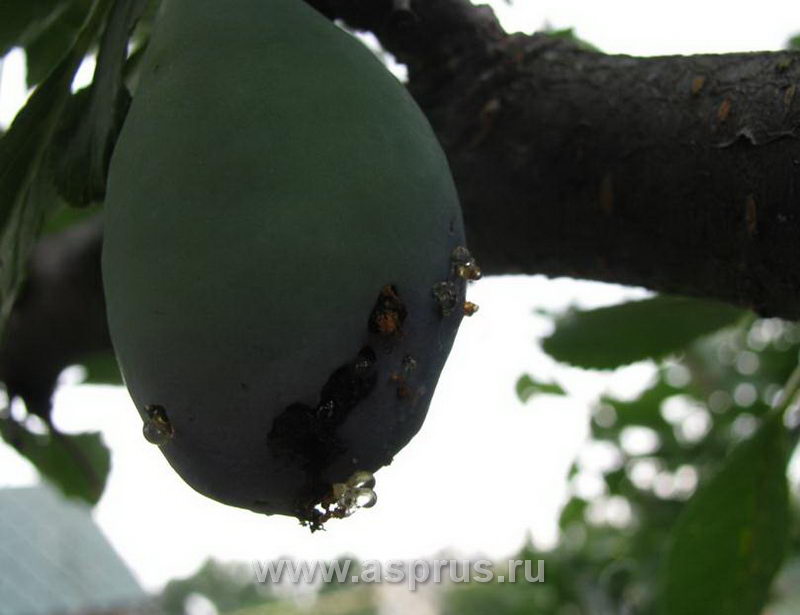 Кроме химических обработок, еще важно каждый день собирать падалицу и закапывать на глубину 40 см. Один этот прием позволяет избавиться от толстоножки – распространенного вредителя сливовых деревьев.