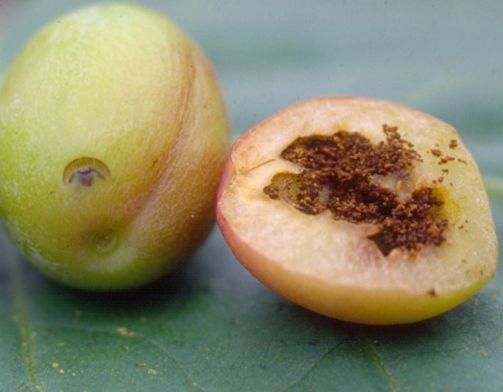 Обработку надо повторить через две недели, так как в это время завязь повреждает еще и долгоносик, который делает в плодах черную воронку, откладывая яйца прямо в косточку.