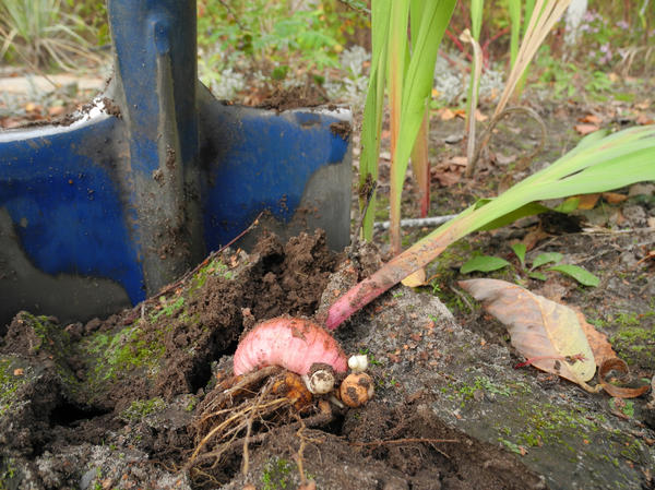 Для удобства выкопки стоит обрезать стебли и листья почти у земли, чтобы не сломать их при работе, хотя обрезать впоследствии всё равно придётся. Выкапывать луковицы надо крайне осторожно: дело не только в том, что можно повредить луковицу, этого-то почти никогда не бывает. Очень непрочно к ней крепятся детки, и надо постараться, чтобы они не осыпались.